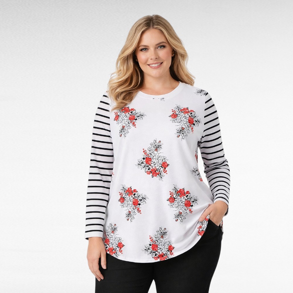Etuosassa punainen kirjava kukkakuvio. Selkäosa ja hihat ovat mustavalkoraidallisia. Sopiva hyvin myös jakun alle.