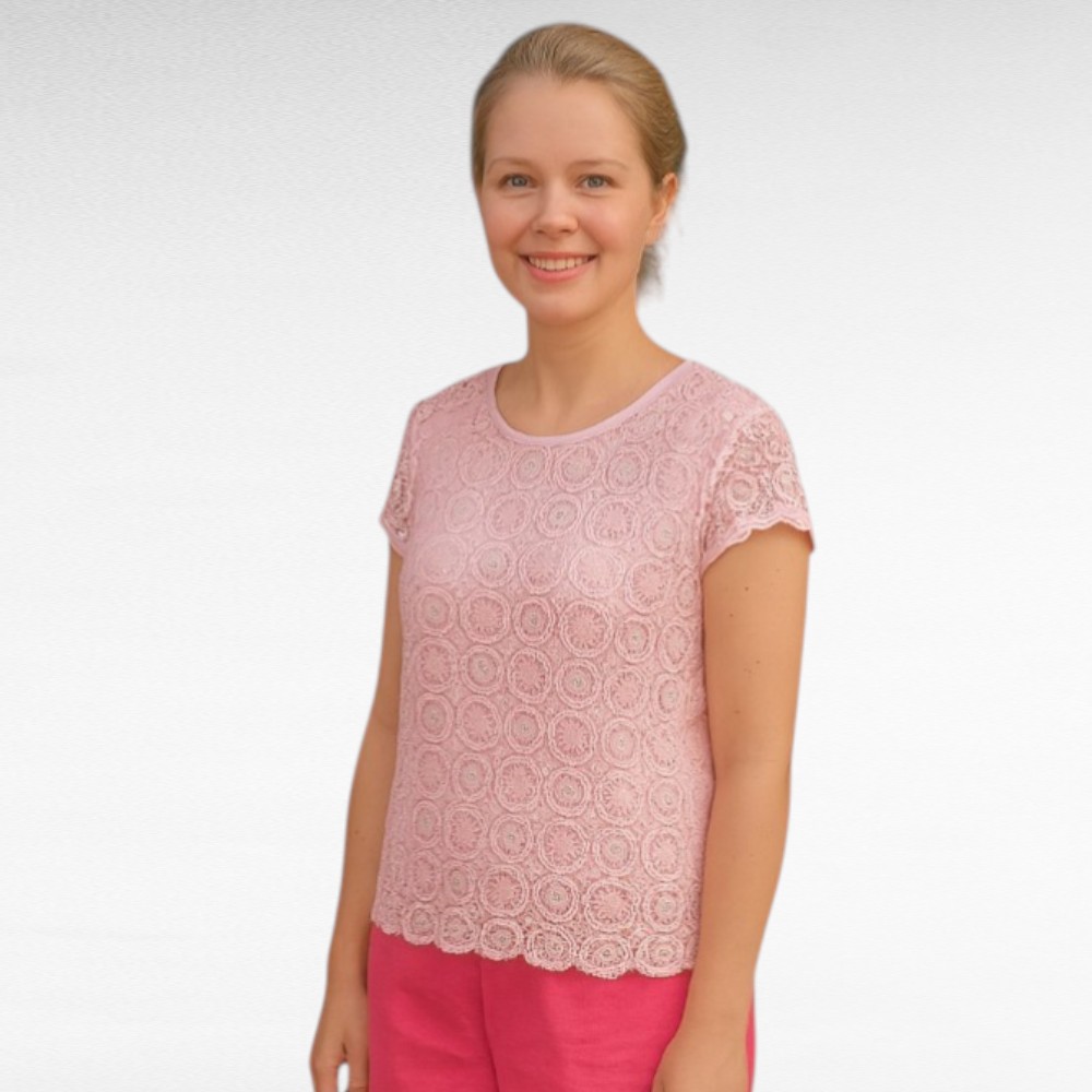 Kaunis vaaleanpunainen lyhythihainen”Impression” pusero. Etuosa on pitsiä, alla vuori, selkäosa on joustavaa kangasta, hihat ovat pitsiä. Olkapäitä koristavat pienet helmet.