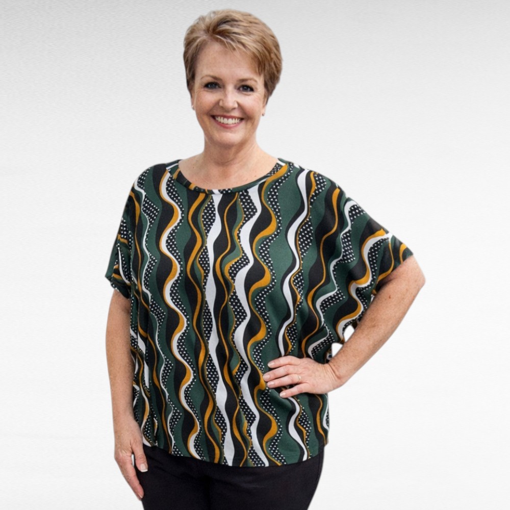 Kuosi on näyttävä: aaltoilevat raidat vihreän, mustan, valkoisen ja sinapinkeltaisen sävyissä luovat elävän ja hieman retrohenkisen ilmeen. Pääntie  pyöreä ja klassinen, sopien hyvin jokapäiväiseen käyttöön.