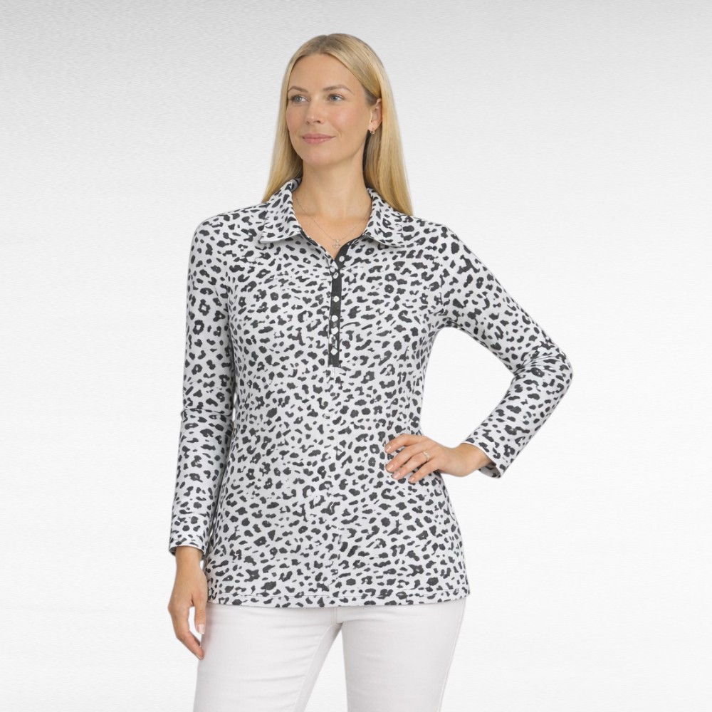 Yksinkertainen, suoralinjainen pitkähihainen ”EP New York”pusero. Valkoisella pohjalla musta pilkullinen kuvio. Edessä lyhyt nappilista ( ja 5 nappia), joka on samaa kangasta, reunassa kapea musta raita. Klassinen kaulus. Hihojen alaosa on samasta kuosista pitsiä.