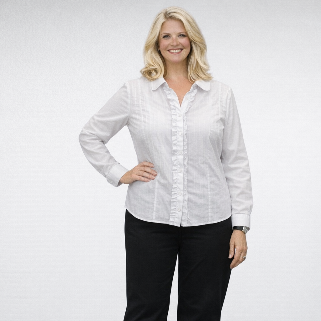 Ajaton ja naisellinen paita”Annabells” röyhelöreunaisella nappilistalla. Pyöristettykauluksinen malli ja pitkät hihansuut tuovat viimeistellyn ilmeen. Kevyesti muotoiltu leikkaus – sopii niin töihin kuin vapaa-aikaan.
