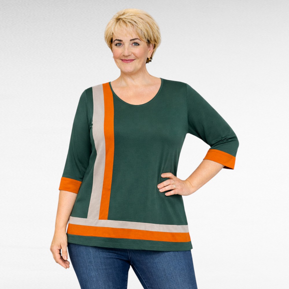 3/4-hihat on viimeistelty oranssilla käänteellä, joka tuo ilmettä ja tekee puserosta näyttävän mutta silti hillityn valinnan. Hihansuissa, oranssin osan kohdalla, on pienet halkiot, jotka lisäävät mukavuutta ja viimeistelevät yksityiskohdan kauniisti.