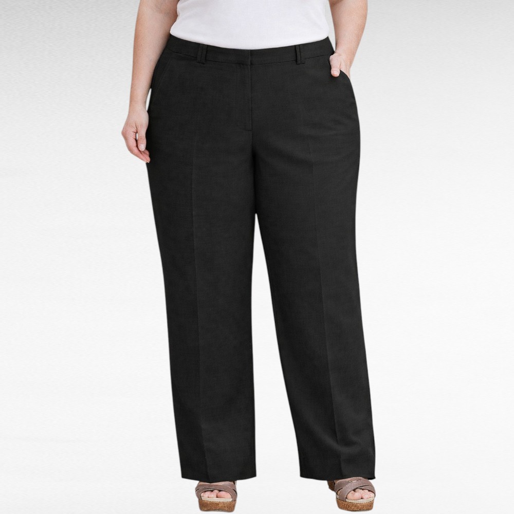 Tyylikkäät mustat housut pellavasekoitteisesta materiaalista. Malli on klassisen selkeä ja miellyttävä päällä: reisissä on hyvin tilaa ja lahje on suora. Vyötäröllä sivuissa pieni jousto-osa, joka antaa noin 3–4 cm lisävaraa. Housut suljetaan vetoketjulla ja hakasella, ja sivuilla on käytännölliset taskut.