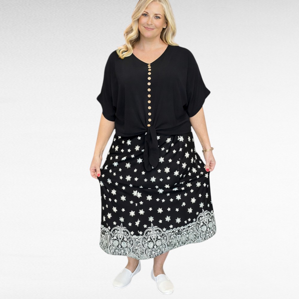 Mustavalkoinen ”Waedrobe” stretch-kukkahame. Vyötäröllä kuminauha.