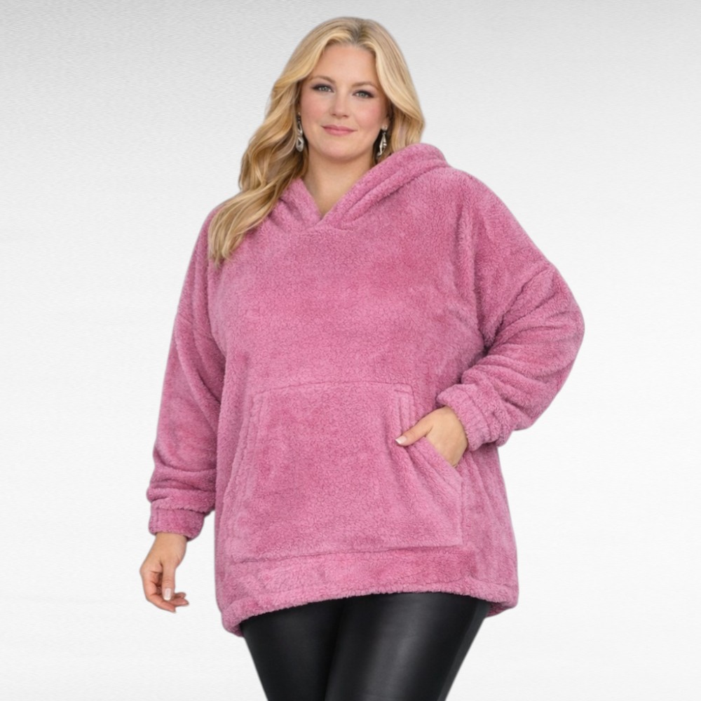Pehmeä vaaleapunainen fleecehuppari “Womanary”. Hihansuissa ja alareunassa resorit.