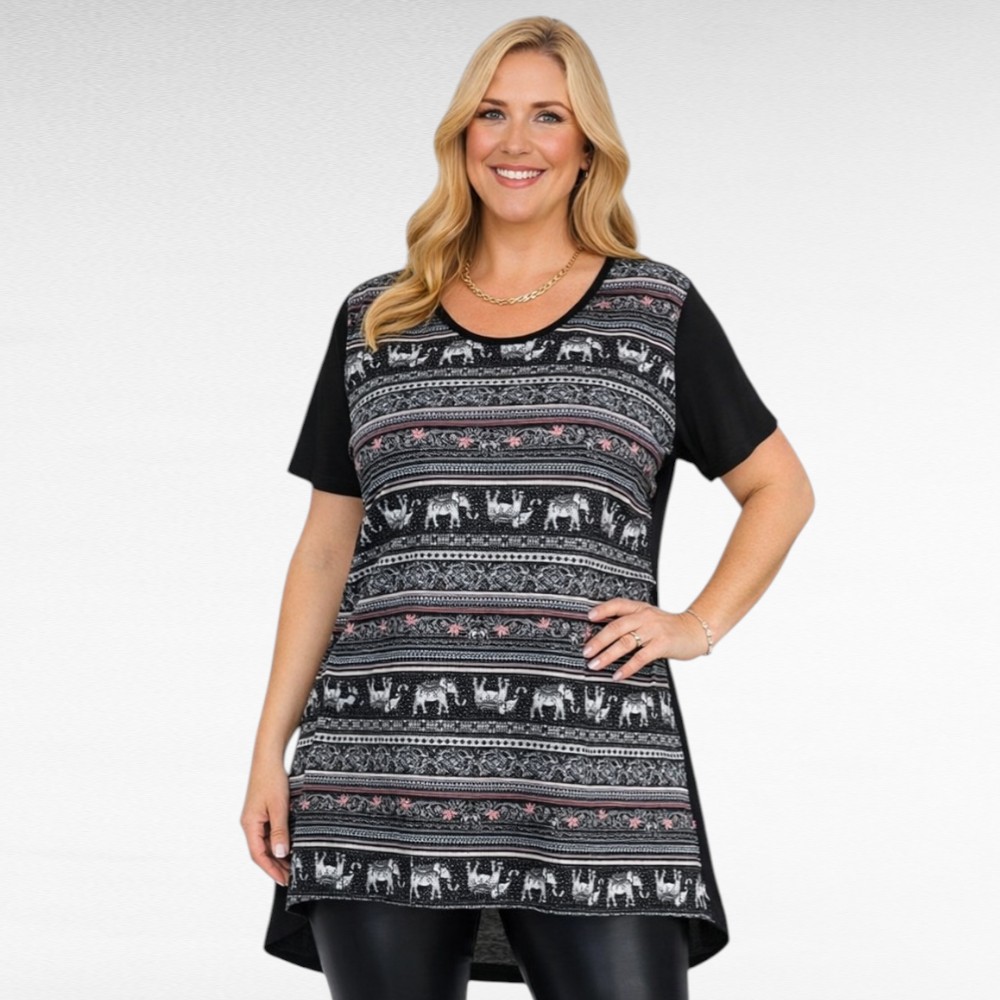 Lyhythihainen ”Ivans” edestä raidallinen kukka-norsukuvioinen tunika . Takaosa on täysin musta ja hieman pidempi kuin etuosa.