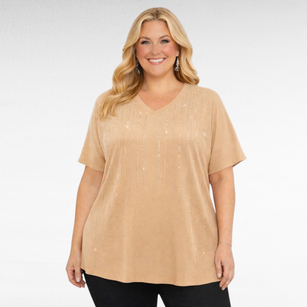 Musta tai beigeä, erittäin hyvästä materiaalista , V-pääntiellä ja A-linjainen tunika, jossa on hillitysti säihkyvät pitkittäiset piennet raidat rinnalla. Selkäosa on yksivärinen. Malli on huomattavan hoikentava.