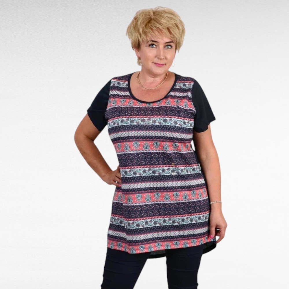 Tummansininen lyhythihainen”Ivans” tunika, jossa raidallinen vaaleanpunainen ja valkoinen kukkakuvio. Takaosa on tummansininen ja hieman pidempi kuin etuosa.