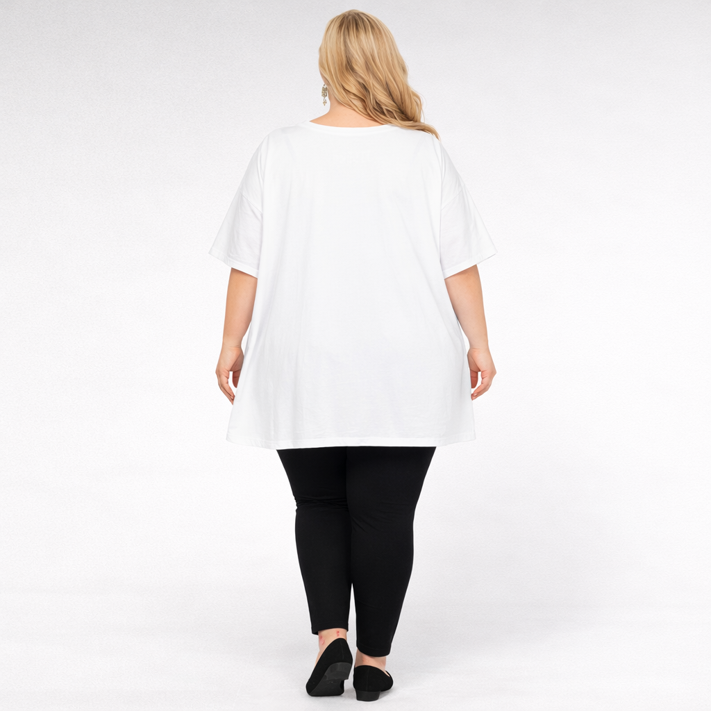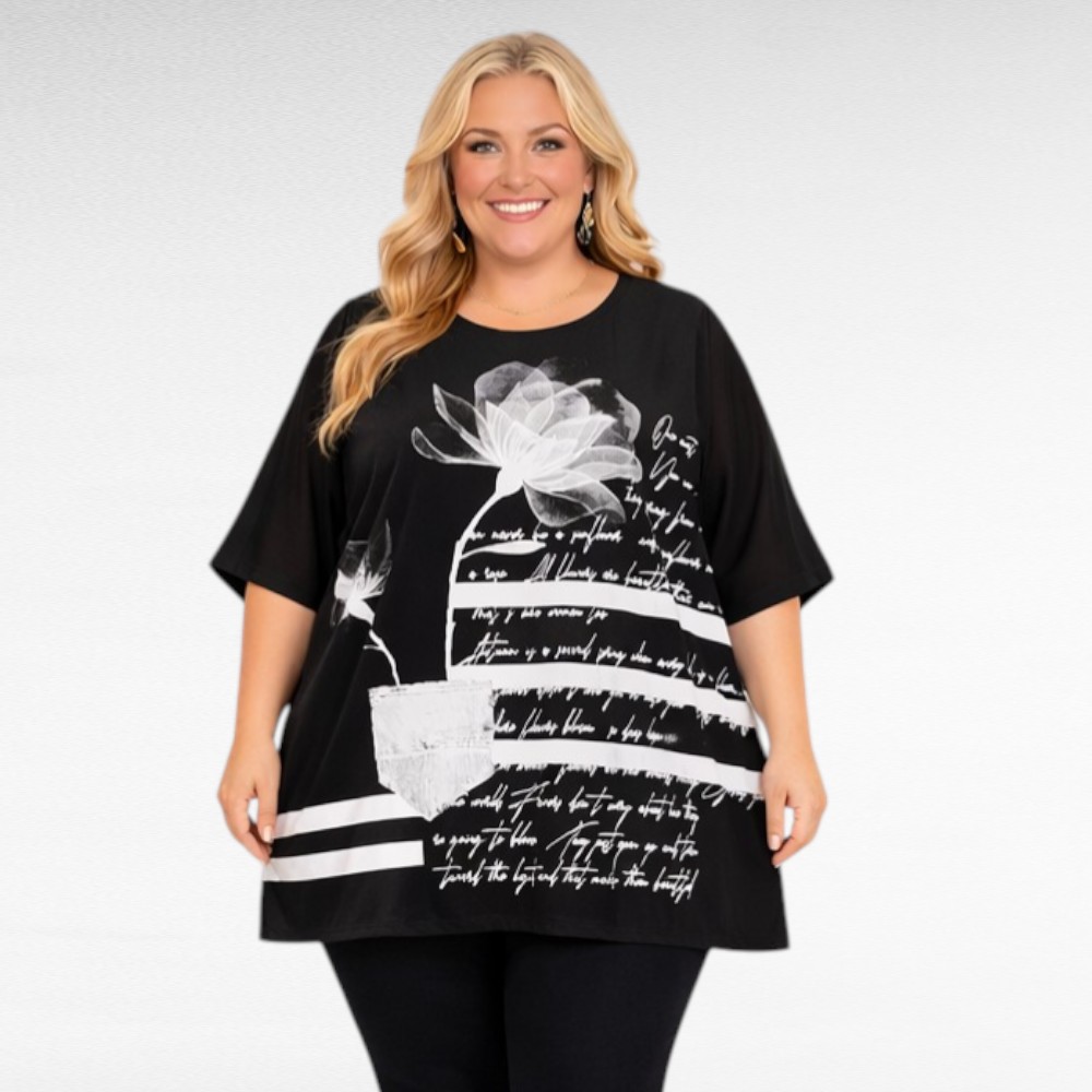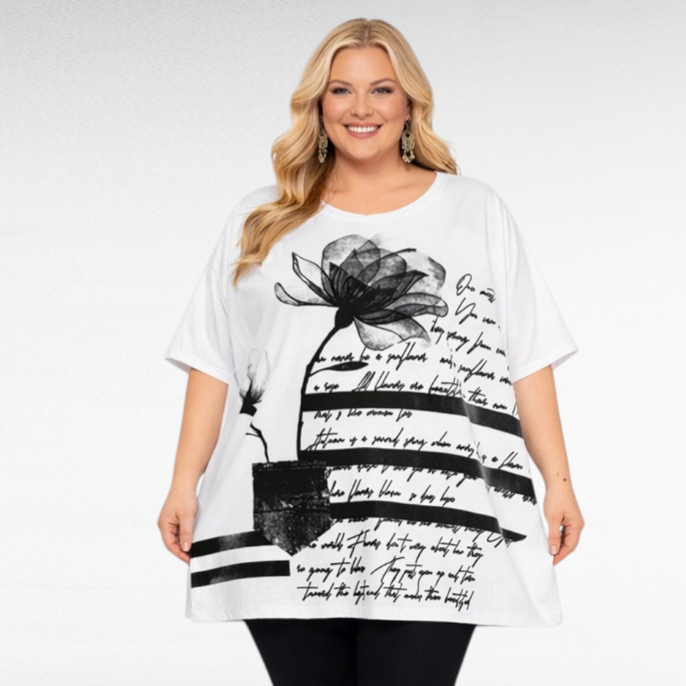 Musta tai valkoinen lyhythihainen puuvillatunika. Rinnalla on suuri printti- kukkakuva ja tekstirivejä. Takaosa on täysin yksivärinen.
