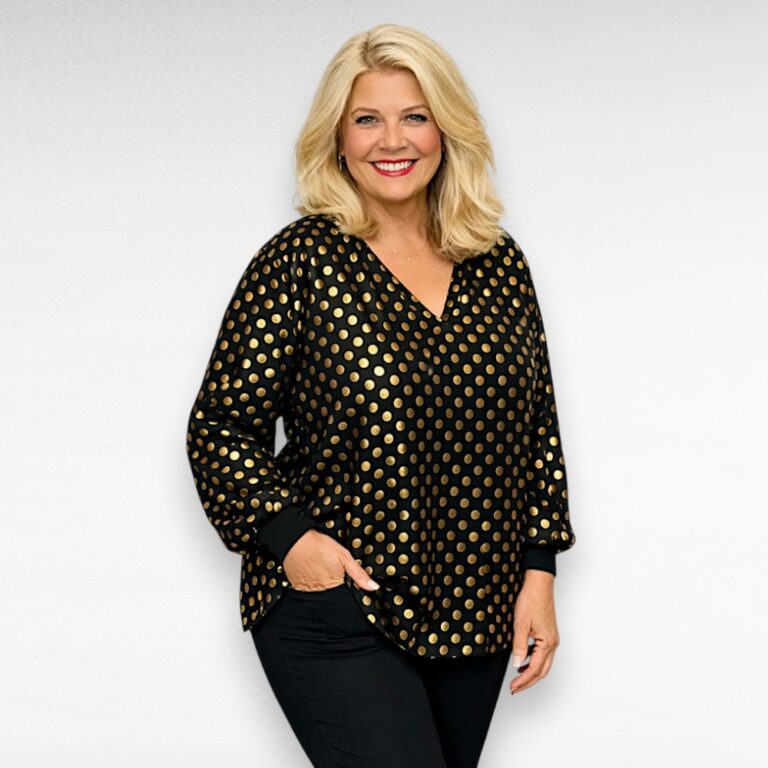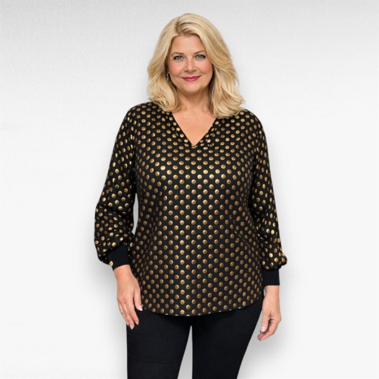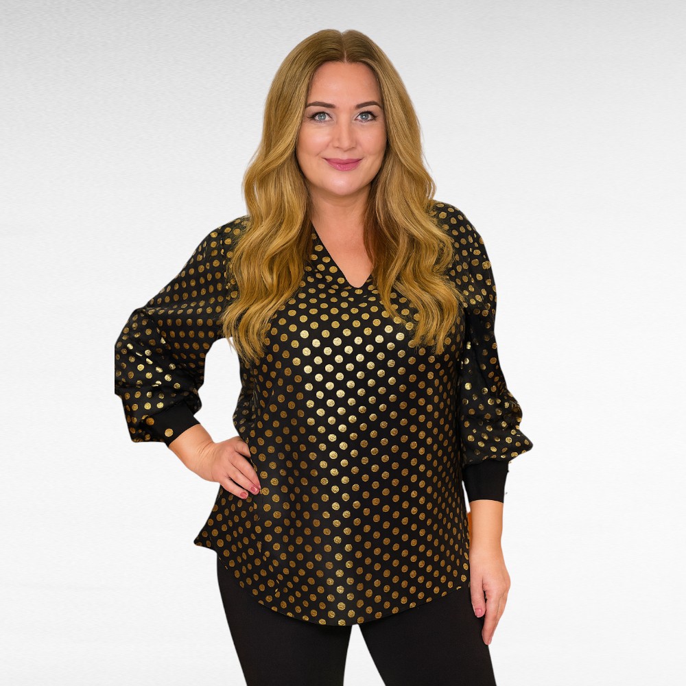 Juhlava naisellinen V-pääntieinen musta–kultakuvioinen pitkähiainen silkkimäinen pusero “Kaira”