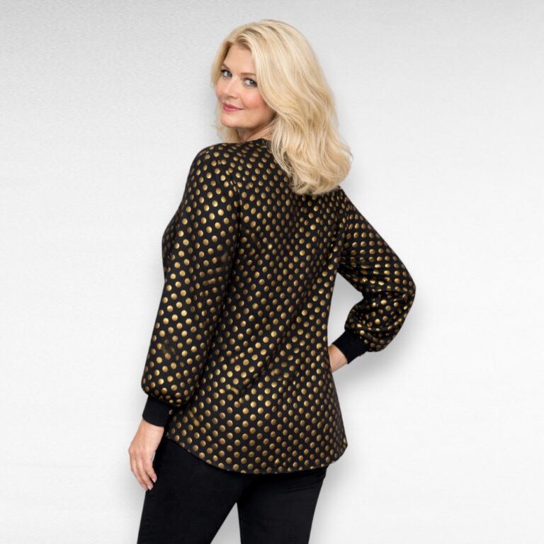 Naisellista juhlatunnelmaa henkivä ”Kaira”-pusero hurmaa sileällä, hieman kiiltävällä pinnallaan ja kauniilla musta–kultaisella kuviollaan. V-pääntie tuo ryhdikkyyttä ja keventää ilmettä perinteisen kauniilla tavalla. Leikkaus on suora – rinnan ja lantion mitat ovat lähes samat – ja helma on takaa hieman pidempi kuin edestä.