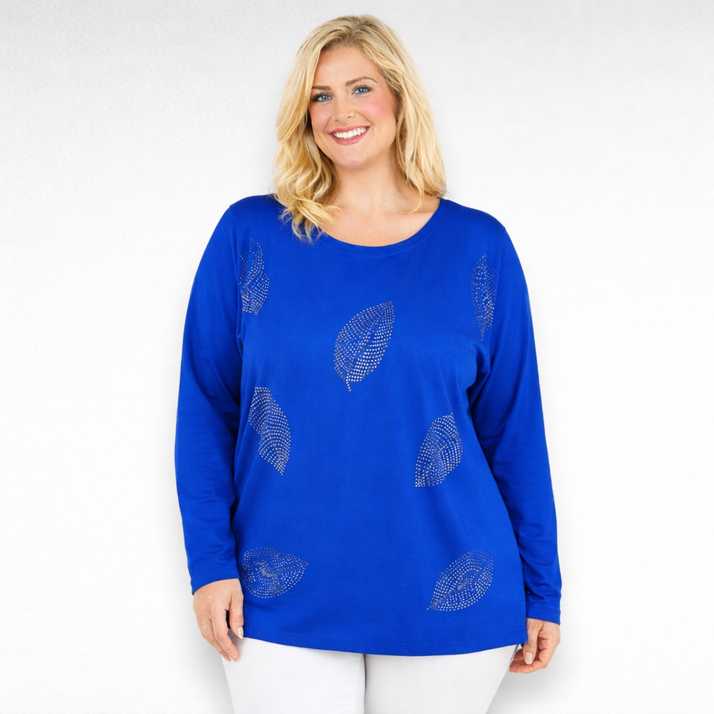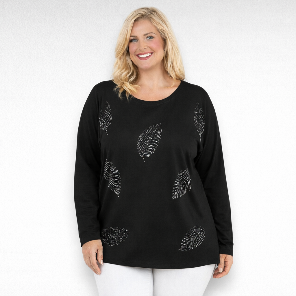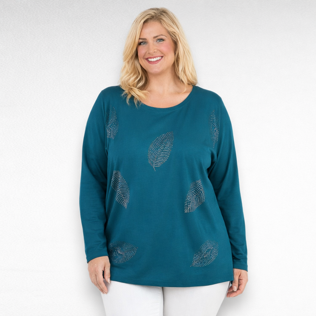 Mukava pitkähihainen ihoystävällinen laadukasta materiaalista puuvillapusero “Womanary”, jossa rinnalla on kaunis, hillitty metallinen lehtikuvio.