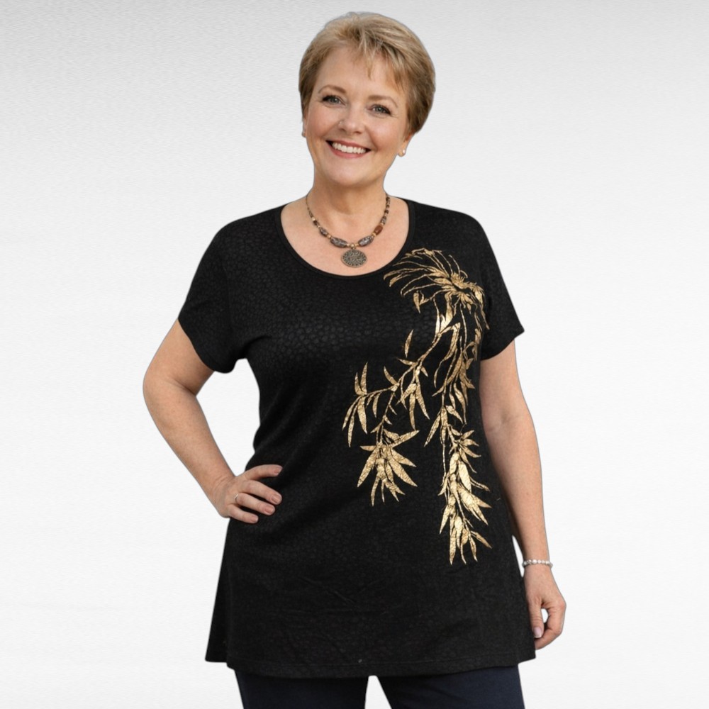 Musta ”Yours Curvy” tunika suurella kultalehtikuviolla.