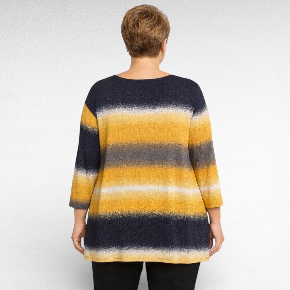 Kauniilla vaakaraidoilla kuvitettu ”Kaija”-pusero, jonka värimaailma yhdistää syvän tummansinisen, sinapinkeltaisen, valkoisen ja harmaan pehmeissä, hieman utuisissa sävyissä. Mukava, kevyesti A-linjainen malli laskeutuu kauniisti eikä korosta liikaa. Pitkät hihat ja pyöreä pääntie tuovat asuun klassisen ja ajattoman ilmeen.