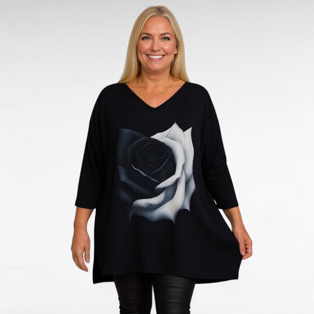 Miellyttävän pehmeä, joustava ja naisellinen musta ”Esmira Fashion”tunika, joka laskeutuu kauniisti ja korostaa vartaloa juuri oikeista kohdista. Rinnan kohdalla näyttävä kukkakuosi, selkäpuoli yksivärinen – yksinkertainen, tyylikäs ja aina ajankohtainen valinta arkeen ja juhlaan.