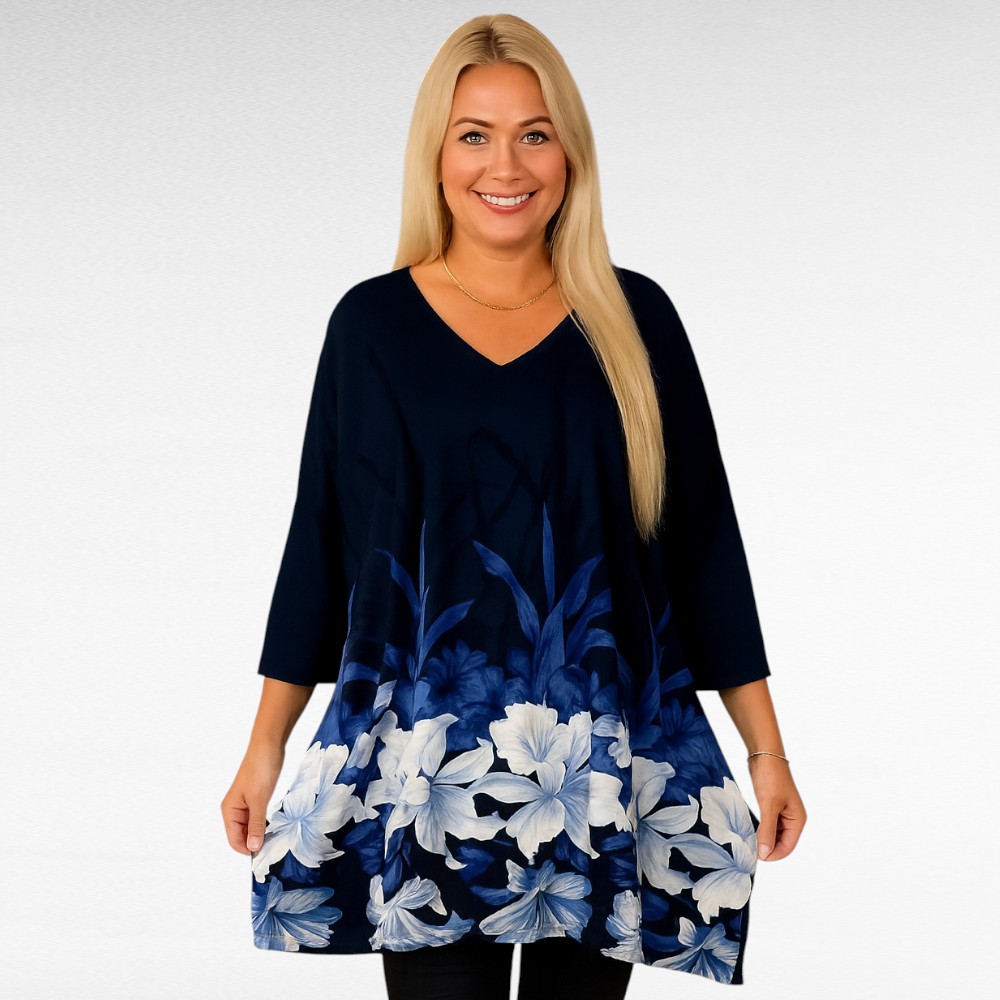 Miellyttävän pehmeä, joustava ja naisellinen tummasininen ”Esmira Fashion”tunika, joka laskeutuu kauniisti ja korostaa vartaloa juuri oikeista kohdista. Etuosan helmassa näyttävä sini-valkoinen kukkakuosi, selkäpuoli yksivärinen – yksinkertainen, tyylikäs ja aina ajankohtainen valinta arkeen ja juhlaan.