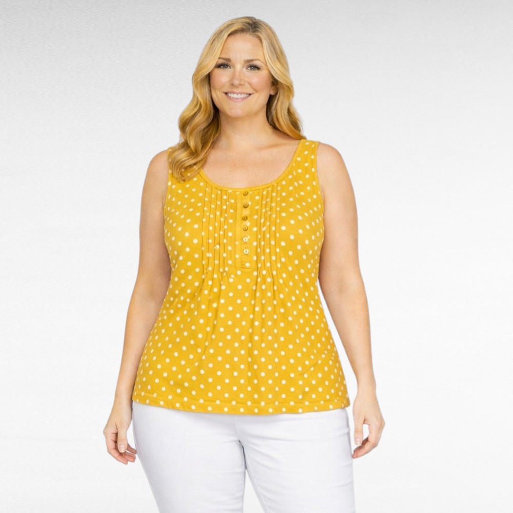 Iloinen kesäinen pilkullinen englantilainen ”Blancheporte” tunika/toppi lämpimässä keltaisessa sävyssä. Kevyt ja kauniisti laskeutuva joustava materiaali, edessä nappilista sekä hienot laskokset tuovat vartalolle kauniin muodon. Pyöreä pääntie ja hihaton malli tekevät tästä mukavan valinnan niin arkeen kuin lomalle. Pituus ulottuu noin lantion keskikohtaan ja sopii hyvin  niin housujen kuin caprien kanssa.